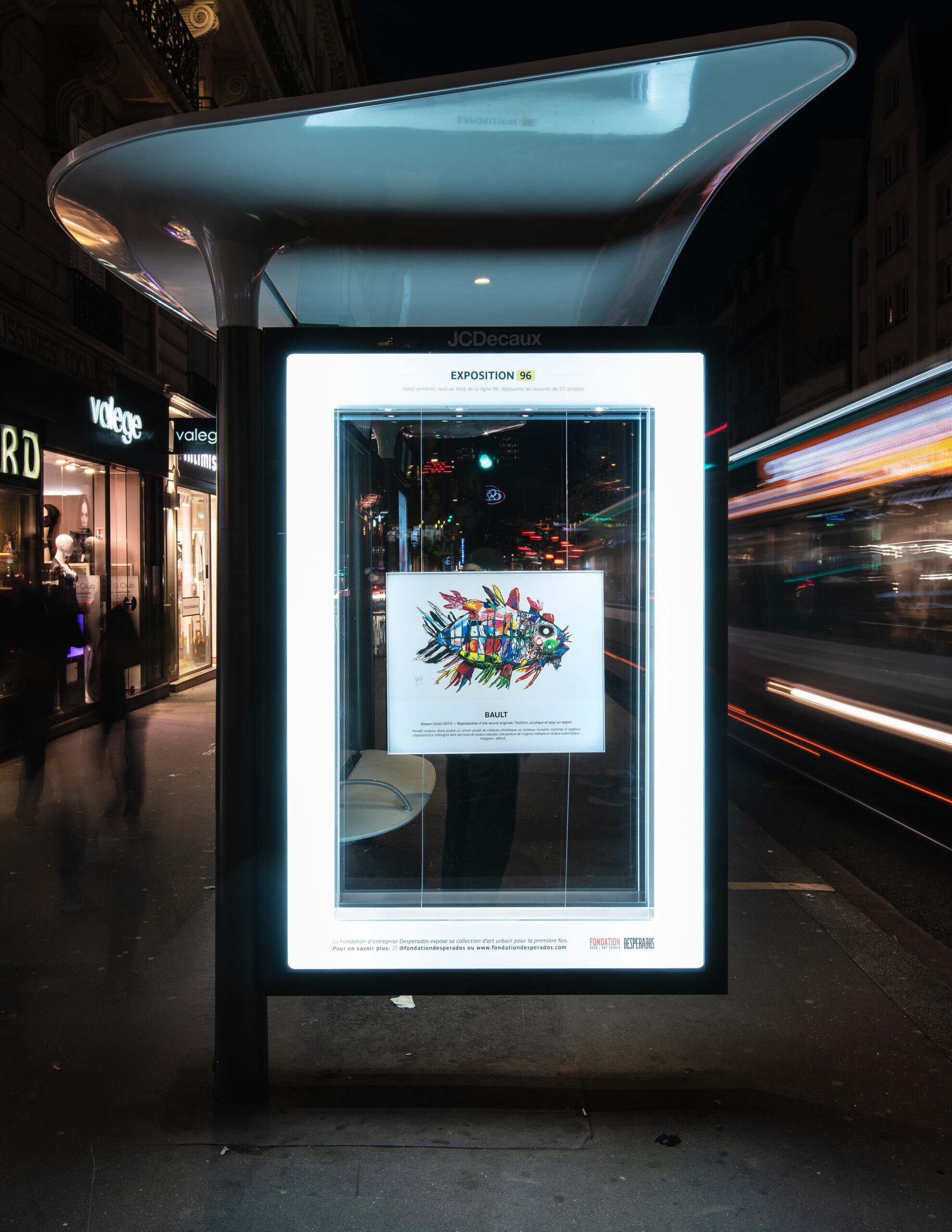 À l’occasion de son lancement, la Fondation Desperados pour l’art urbain dévoile une exposition inattendue dans les abribus parisiens de la ligne 96, entre Montparnasse et la Porte des Lilas.
