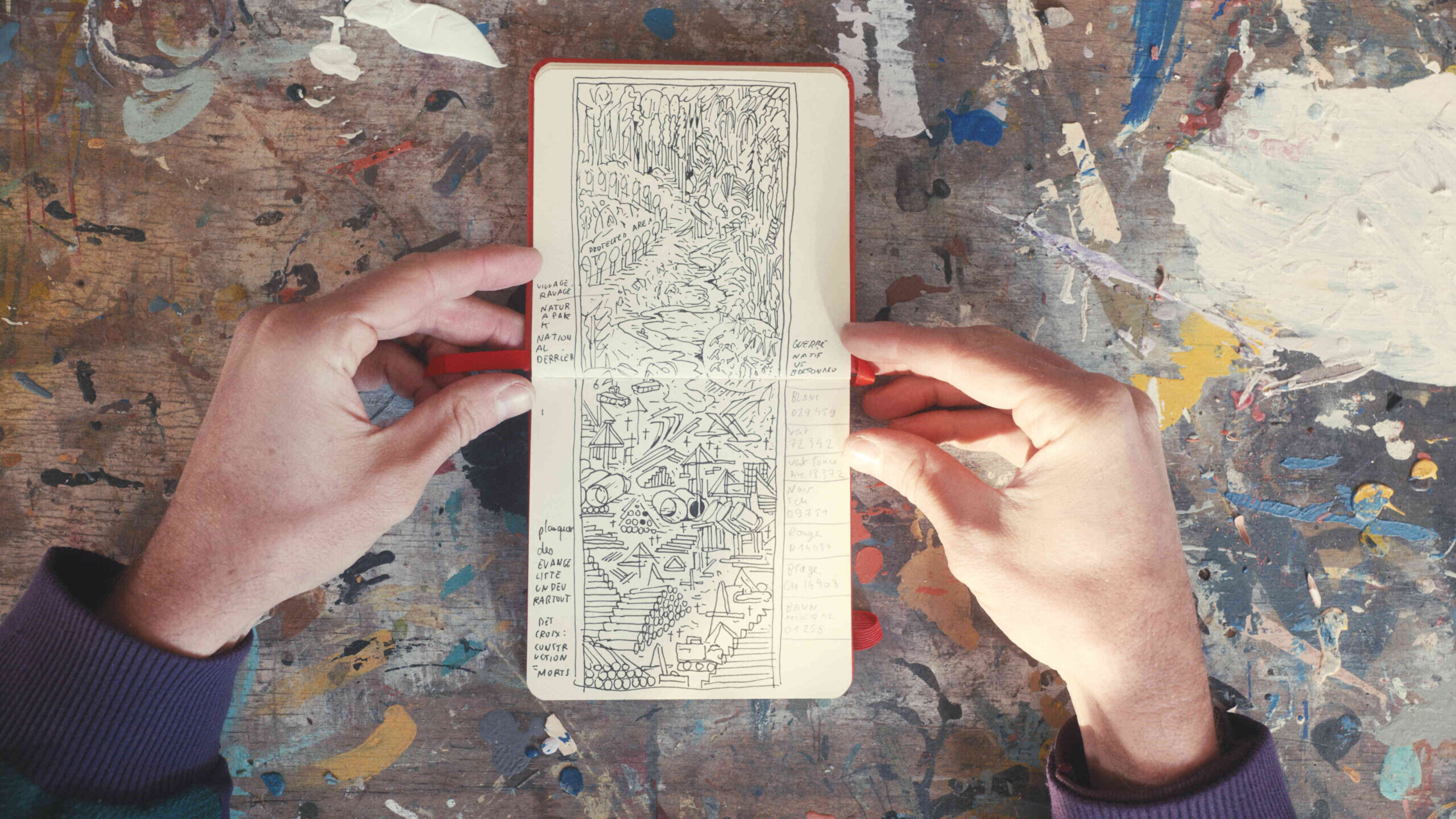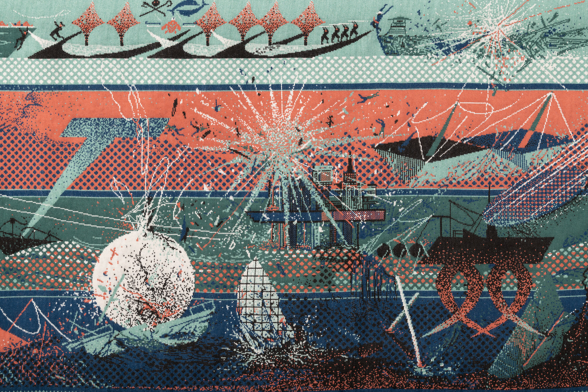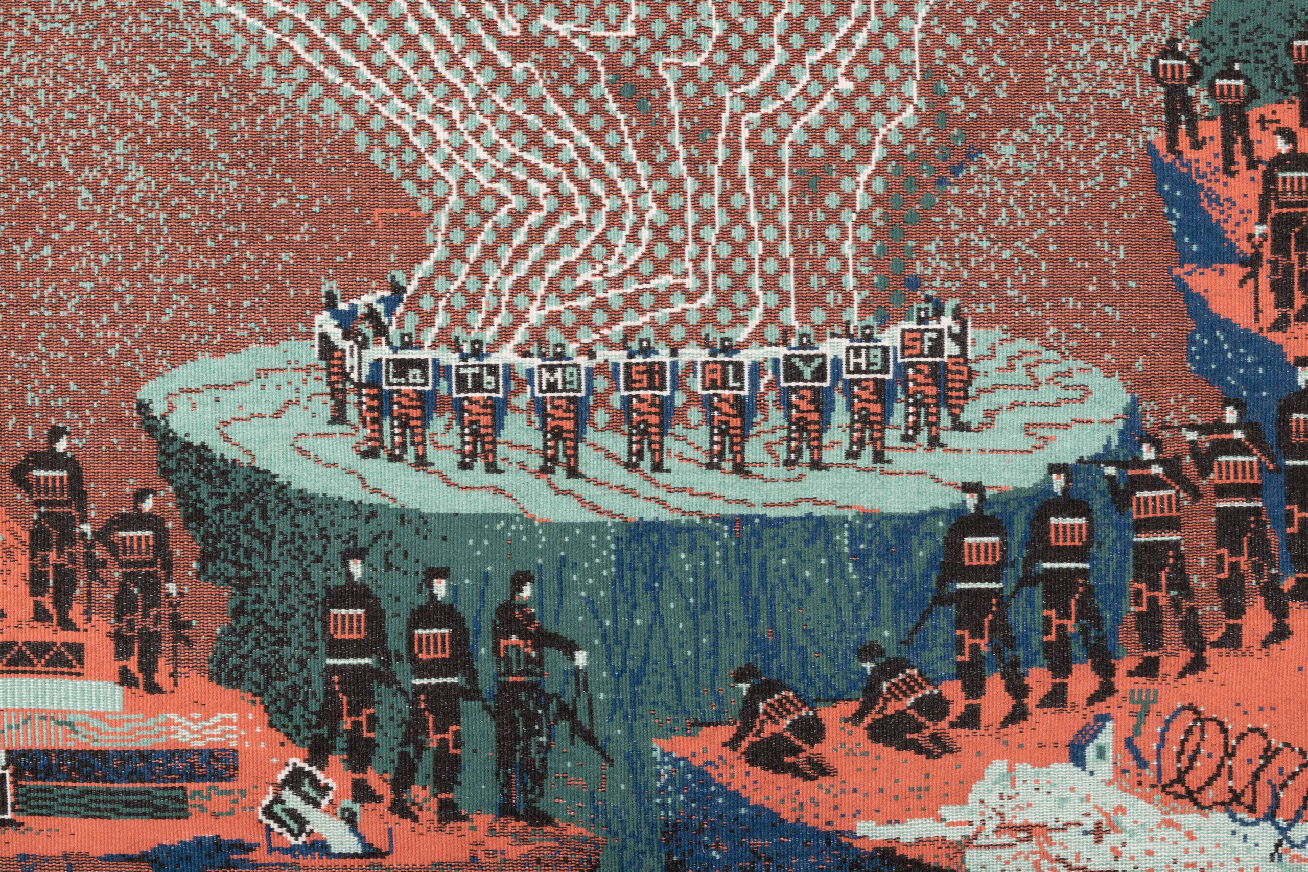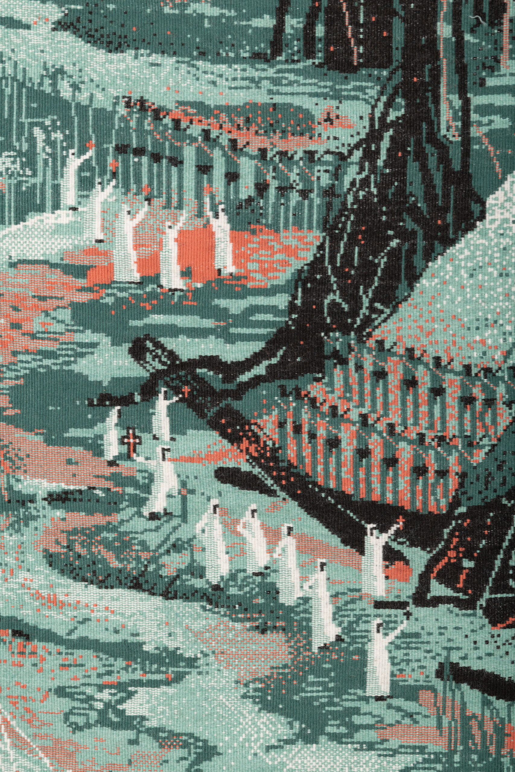 Dans ce projet au long cours, intitulé Vestigium Park et amorcé en 2019, l’artiste revisite les archétypes de l’art ancien pour mieux interroger notre époque. À la croisée des tentures médiévales de l’Apocalypse d’Angers et des tapis de guerre afghans de la fin du XXe siècle, ses compositions prennent la forme de frises narratives foisonnantes. Elles évoquent la complexité des civilisations modernes et traduisent les préoccupations centrales de l’artiste : hyperproduction, épuisement des ressources, rapports de domination, écologie.