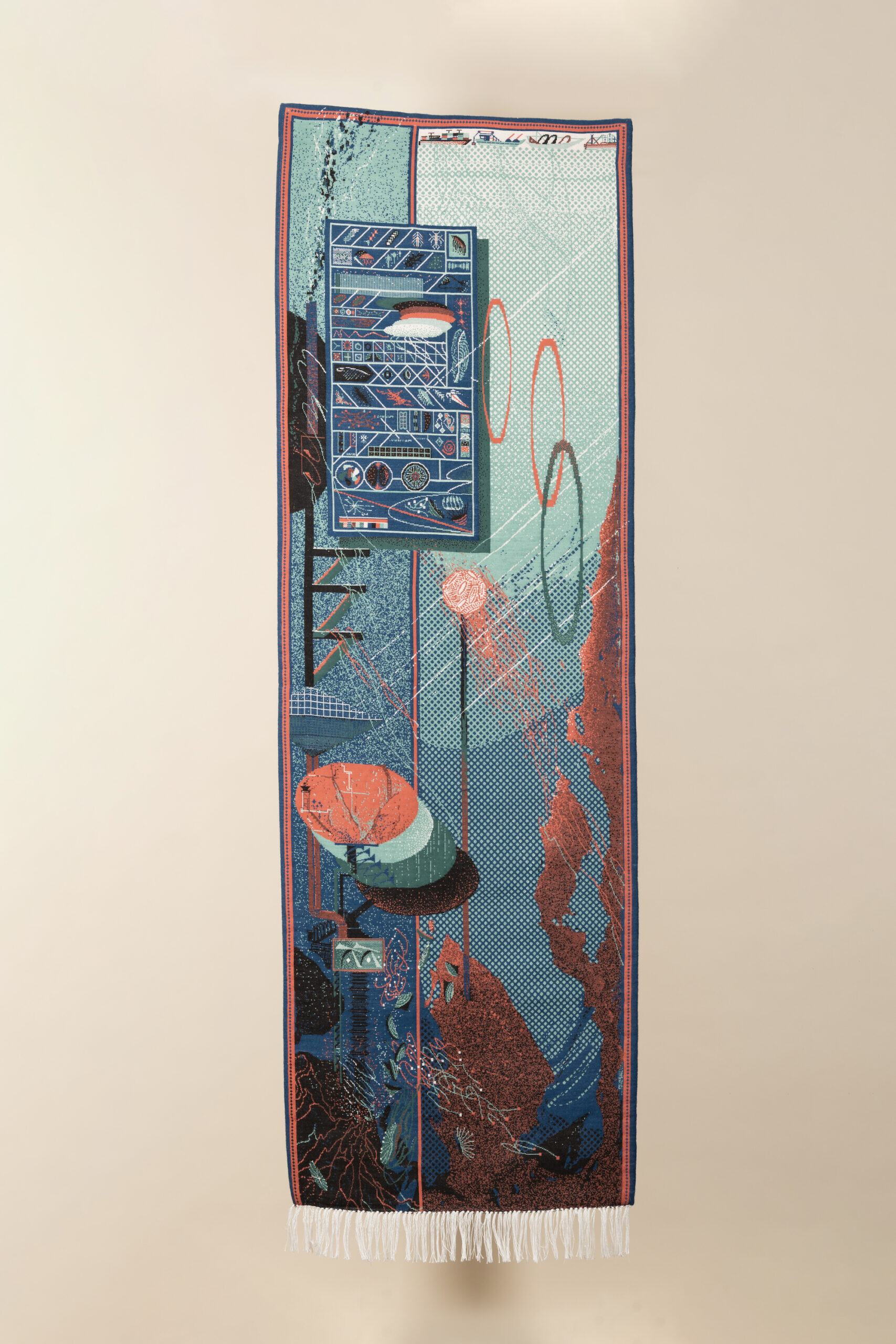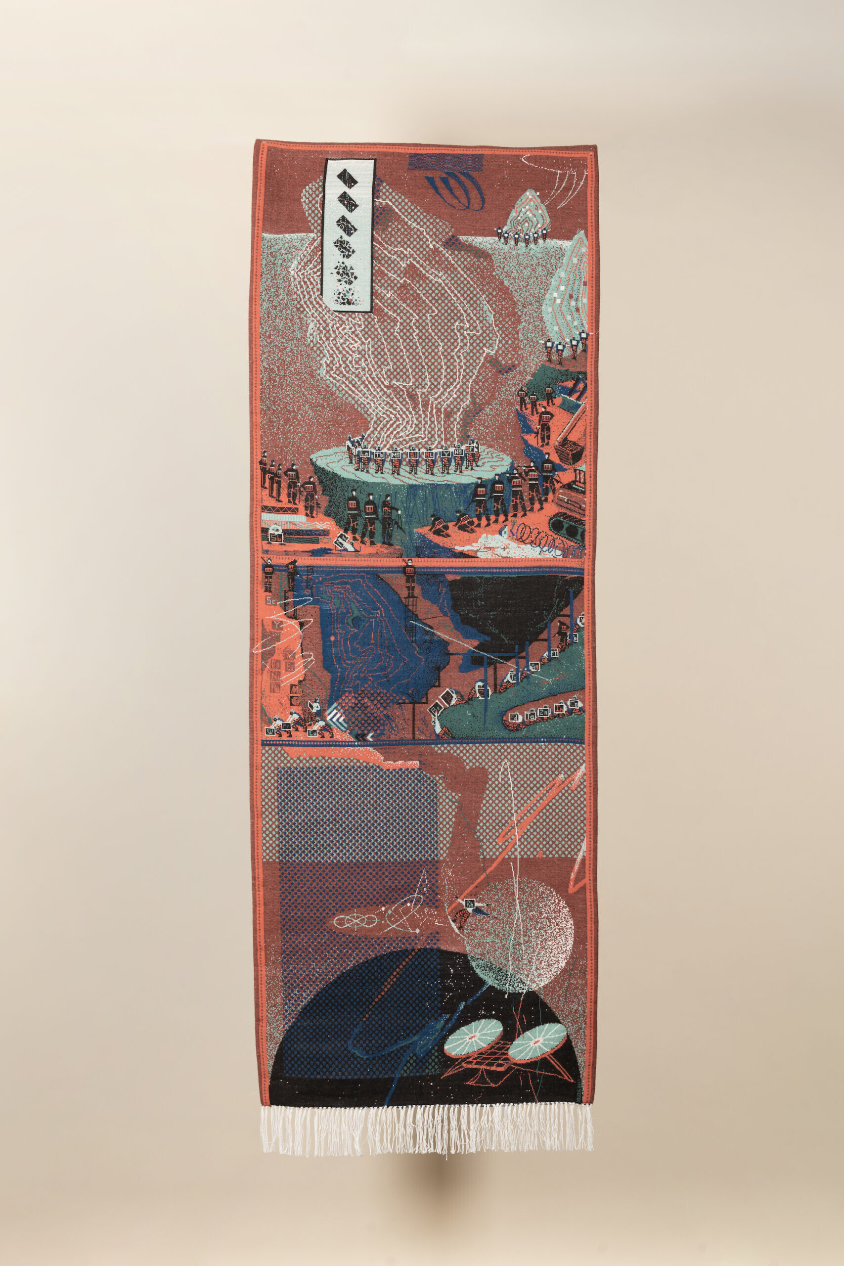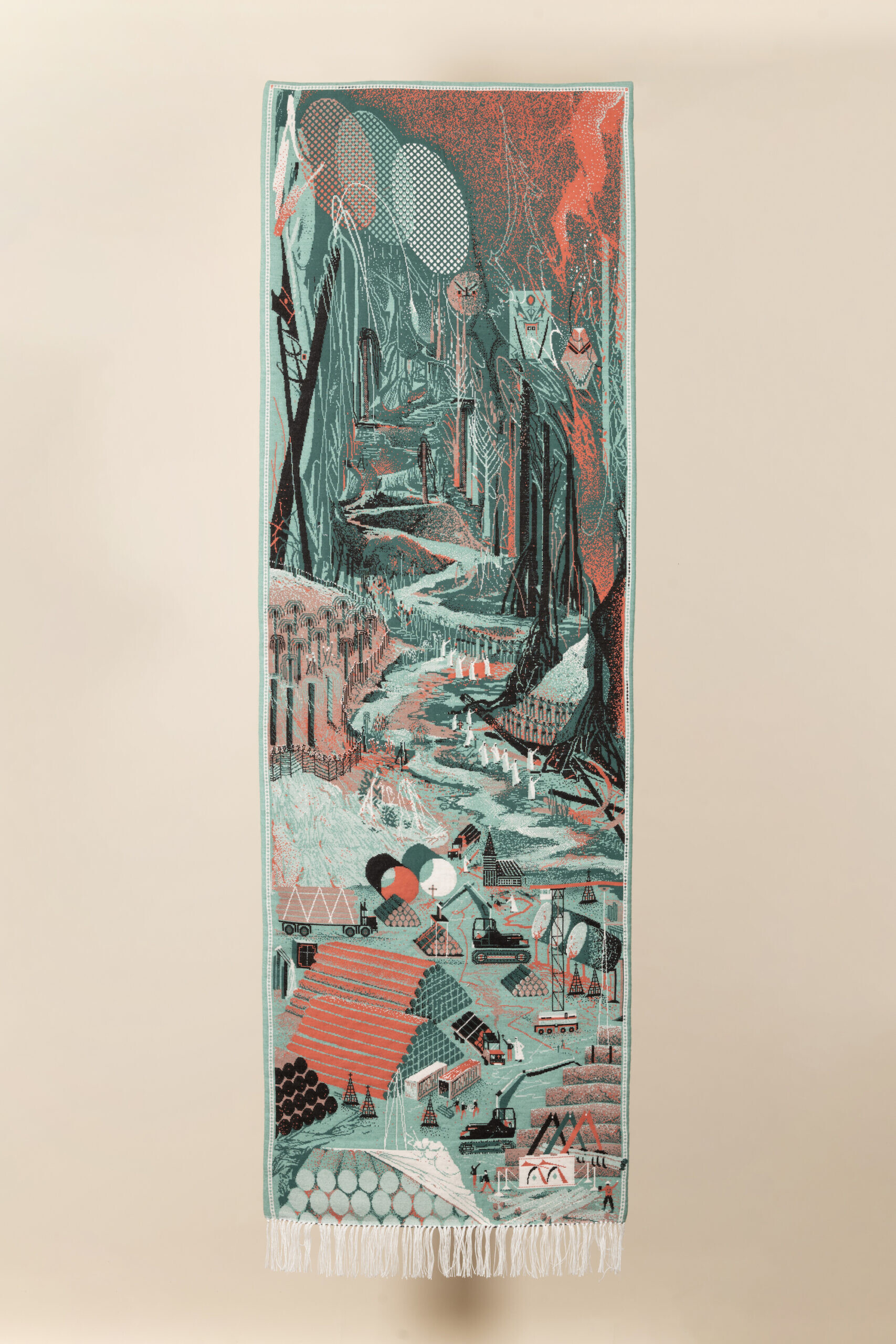 À partir de sa fresque Hétérotopies — un vaste récit écologique illustrant le choc des civilisations — MioSHe a conçu une nouvelle série de quatre tissages thématiques :